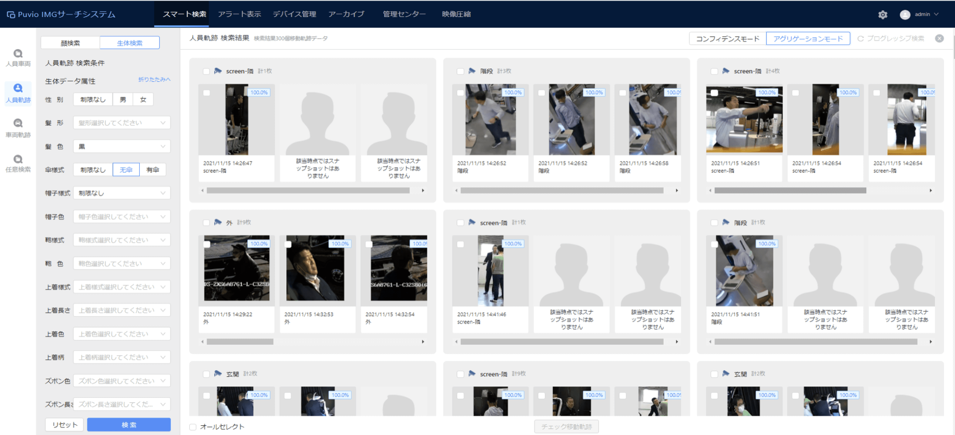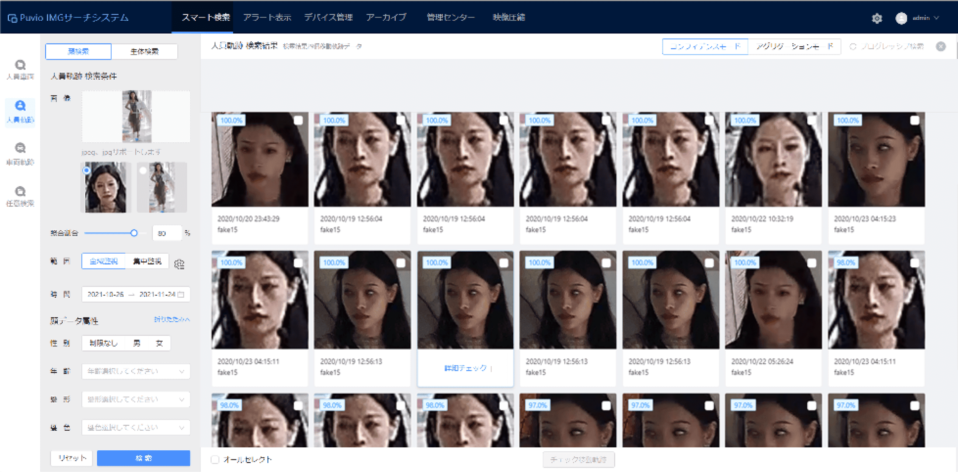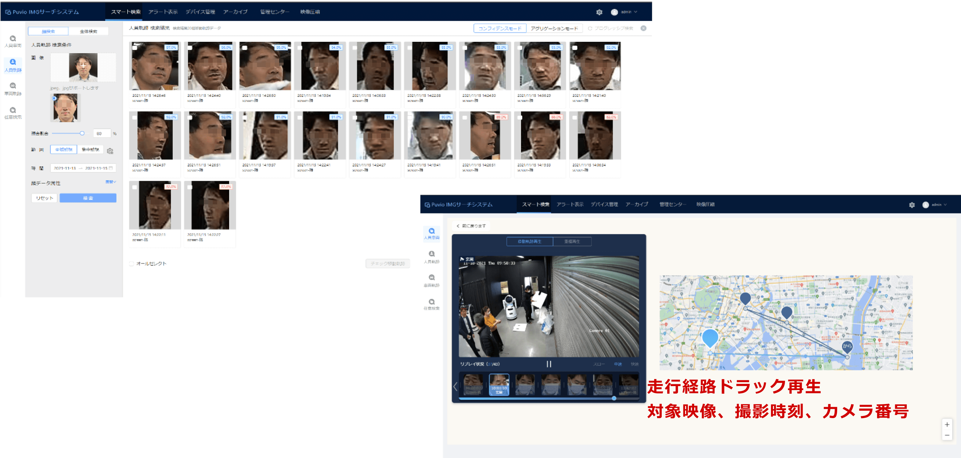 トラック復元:ターゲット画像に対する検索精度を設定でき、また設置カメラの位置や撮影時刻と連動させることによって、監視カメラのカバーエリア内のあらゆる場所での移動軌跡のトラック復元が可能となります。