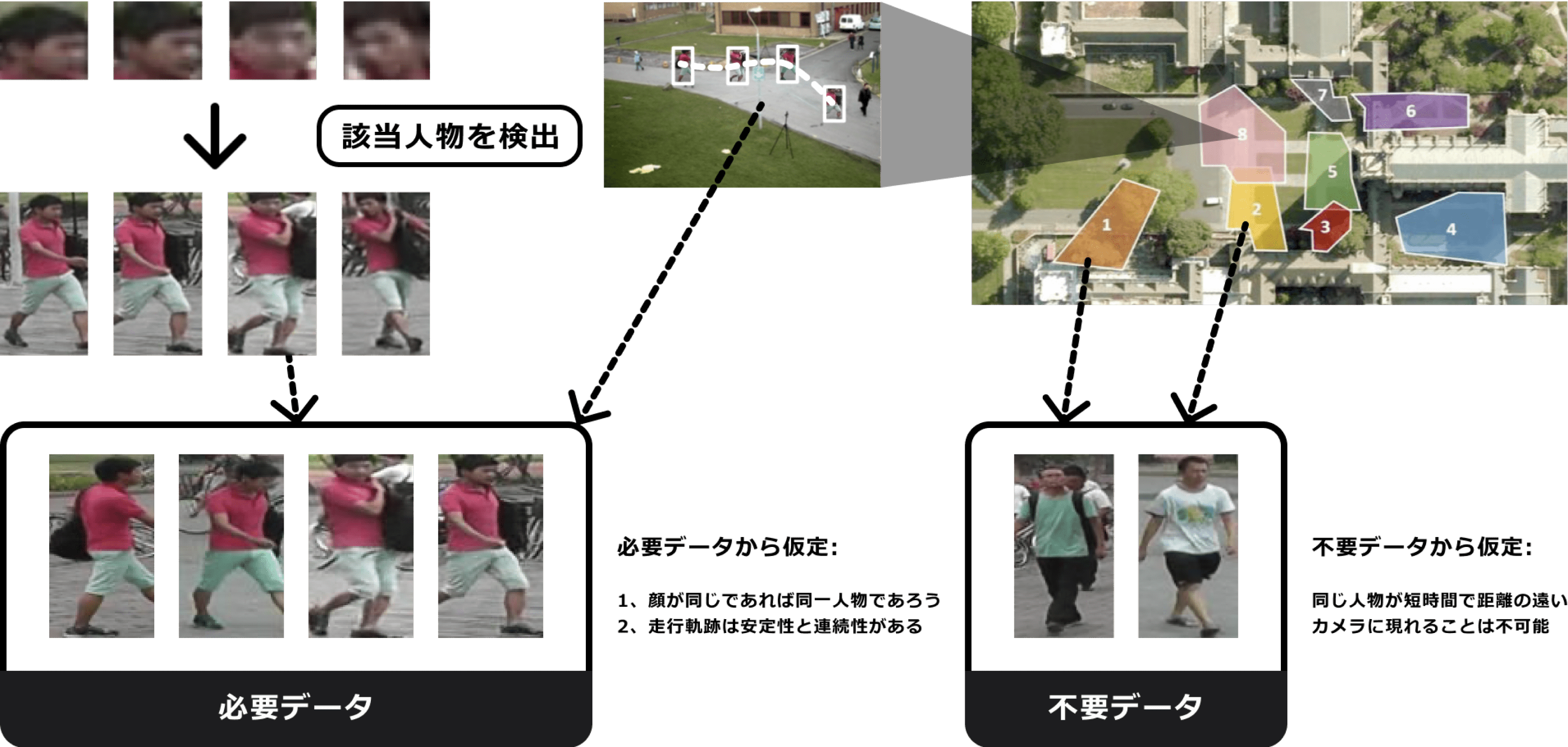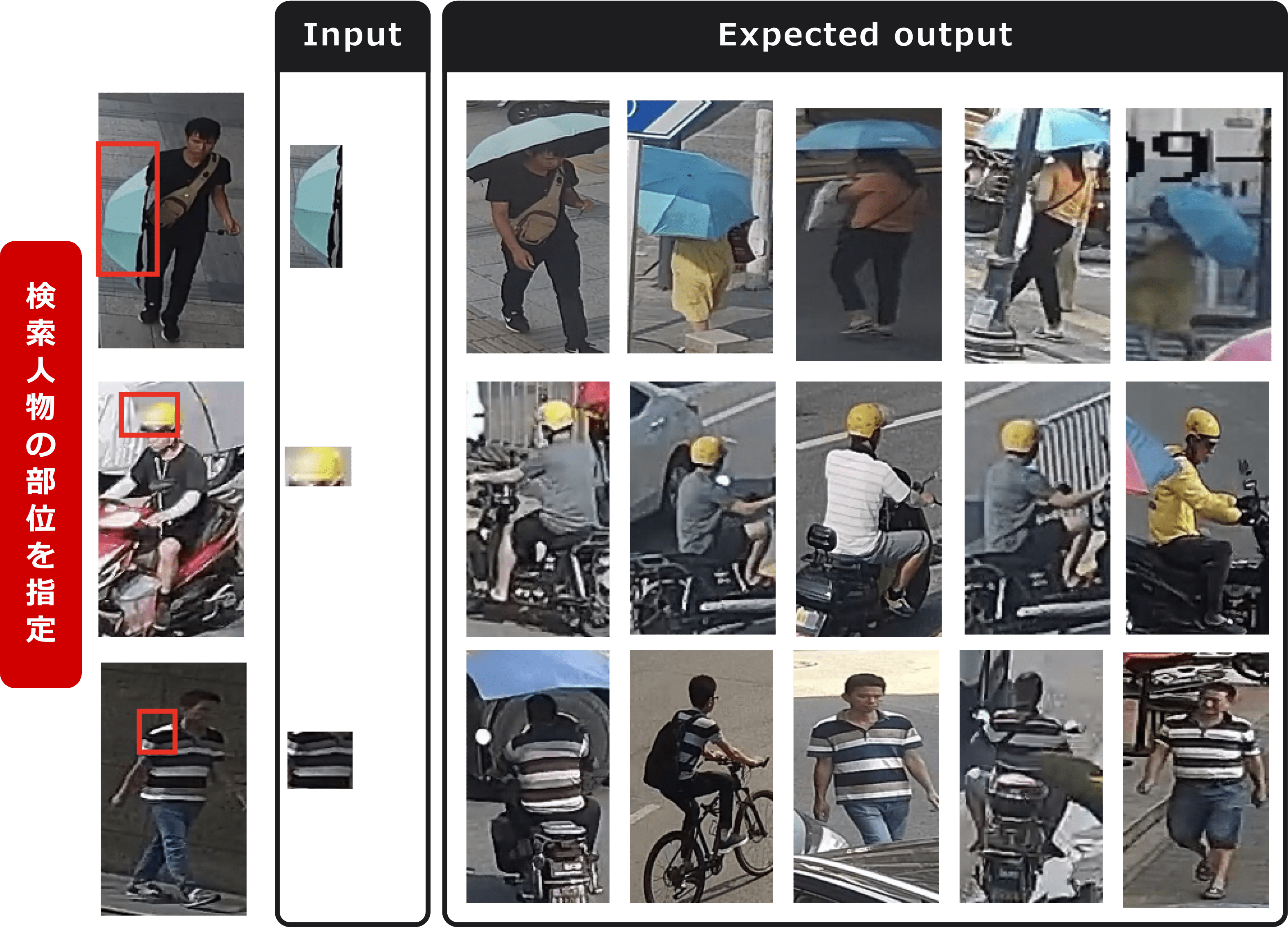 例えば、「光、角度、衣服の着替え」などの物理的なさまたげを理由として、同一人物の映像がカメラによって全く違うように見えても、標的人物のもつ特有なイメージング情報から嗅ぎ分けて同じ人物であることを識別します。