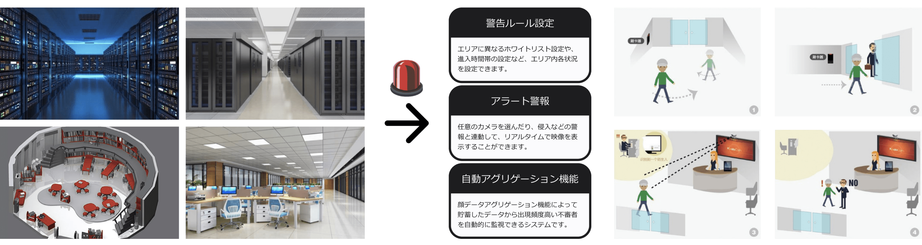 Puvioイメージングサーチシステムの監視カメラシステムは、映像撮影カメラと映像処理装置から構成され、最新の顔認証機能を搭載してます。各エリアに設置しているカメラから収集した映像は顔登録データベースと照合され、エリア権限管理や不審者検出につなげます。この機能は犯罪の抑止効果を高めると同時に、事件・事故発生時の重要な証拠となります。