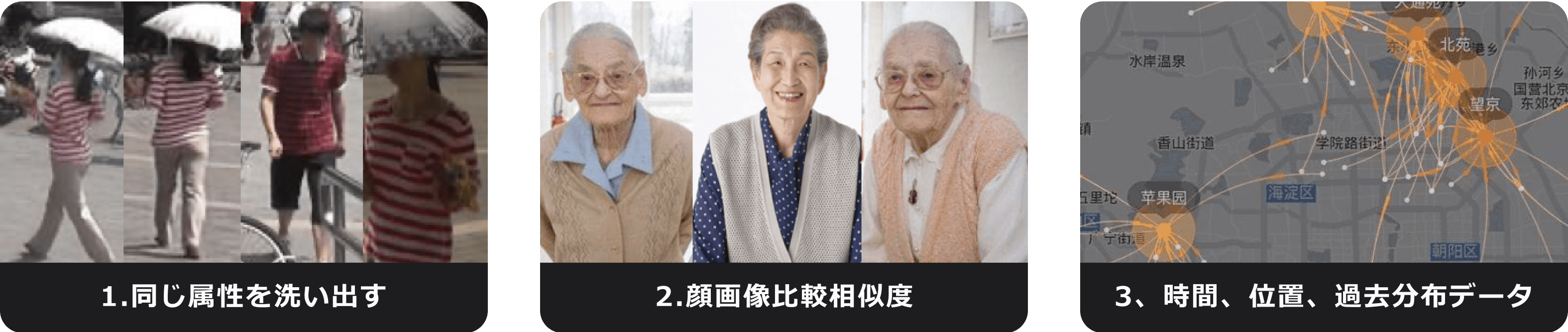 エリア内のの異なるカメラの映像を通して位置走行経路の論理的関連性や、規則性、特有性などの潜在的情報によって確率分布情報を統計的に分析し、より正確に標的を識別します。