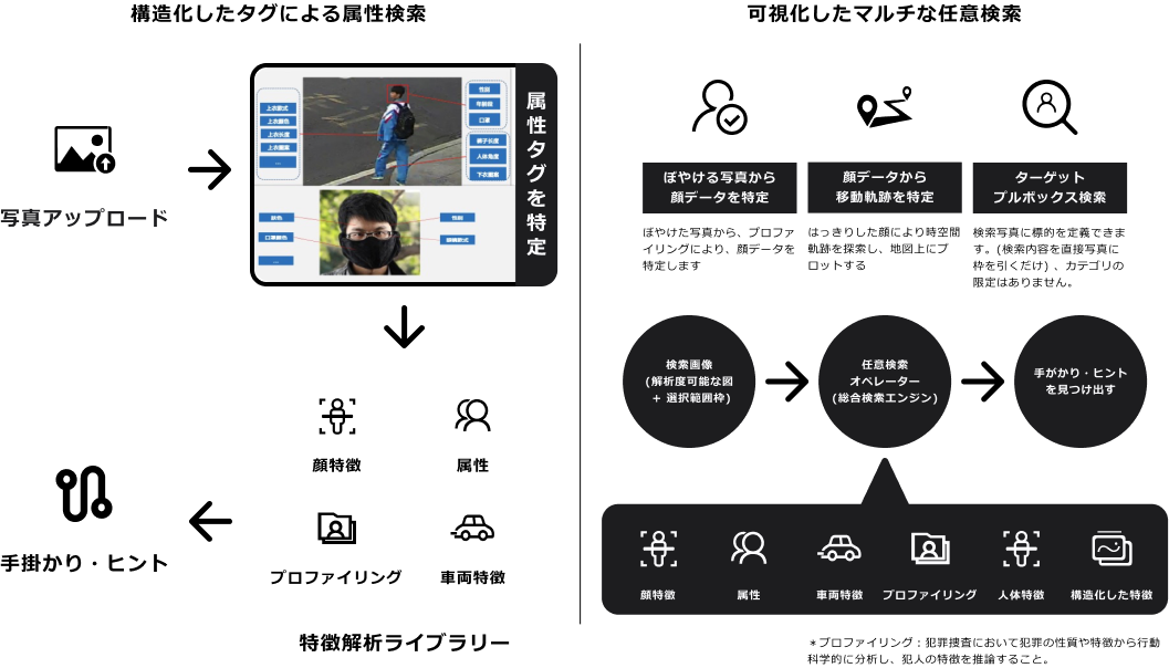 身元確認:人物の画像または関連情報から検索する。車両は車両ナンバーから身元確認する。